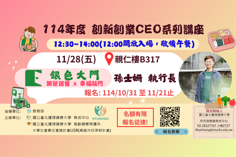 - 《中心訊息》【活動報名】114年度創新創業CEO系列講座-銀色大門-【銀髮送餐 x 幸福敲門】 2025/10/30