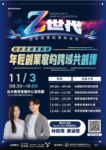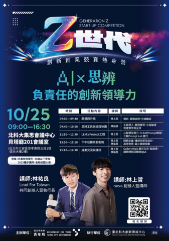 - 【函轉】國立臺北科技大學創新育成中心執行臺北市政府青年局114年度「Z世代創新創業競賽」 「AI × 思辨:負責任的創新領導力」 2025/10/14