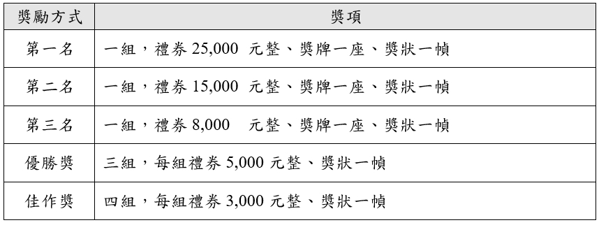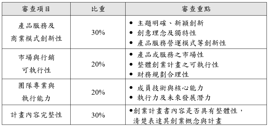 - 初審審查標準:總分 100 分,預計選出前 10-15 組團隊,必要時得以「從缺」辦理。