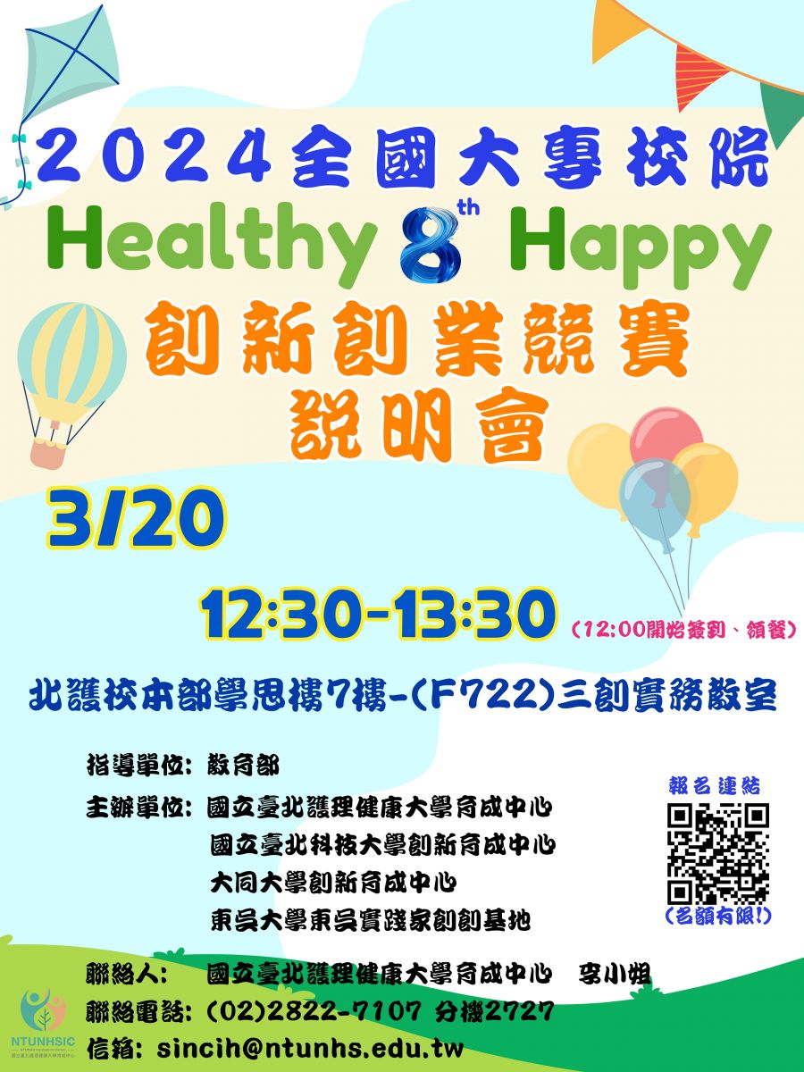 ●113年03月20日(週三)12點30分在學思樓7樓F722(三創實務教室),辦理2024(第八屆)全國大專校院「Healthy x Happy」創新創業競賽說明會。