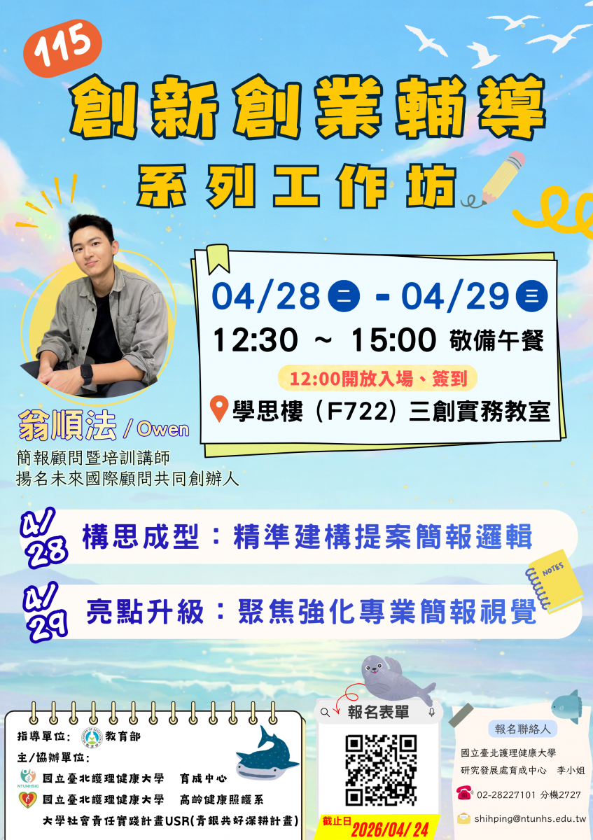 【創業簡報 活動報名開始】115年度創新創業輔導系列工作坊來囉!歡迎踴躍報名,名額有限哦~~